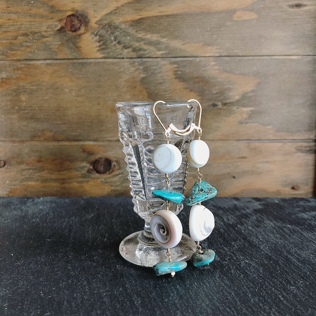 渦巻き模様の入ったシヴァアイ、スパイラルのシェルパーツにアクセントとしてターコイズを合わせ、夏にぴったりのピアスに仕上げました。