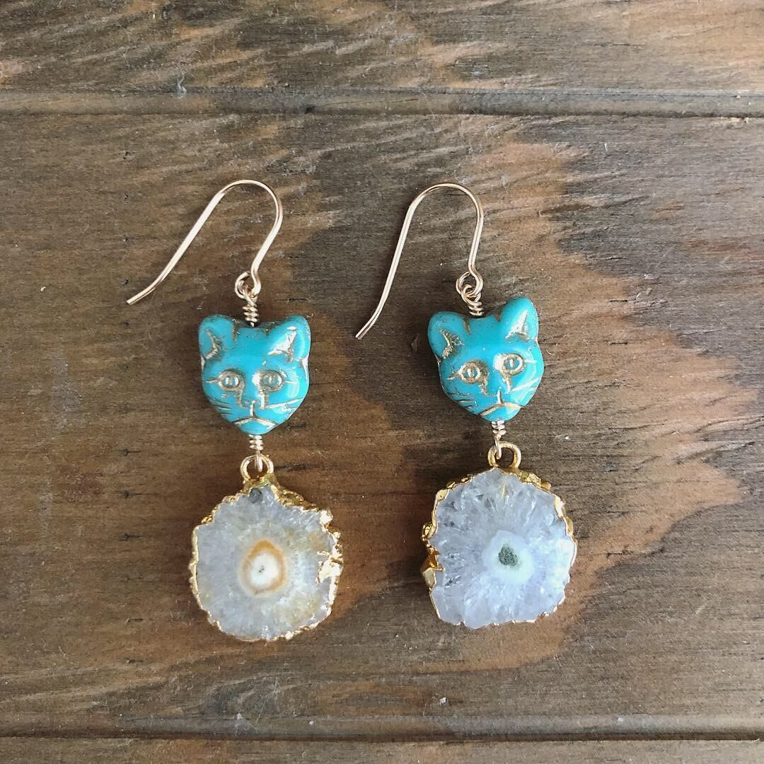チェコビーズ×ソーラークォーツの猫フェイスピアス