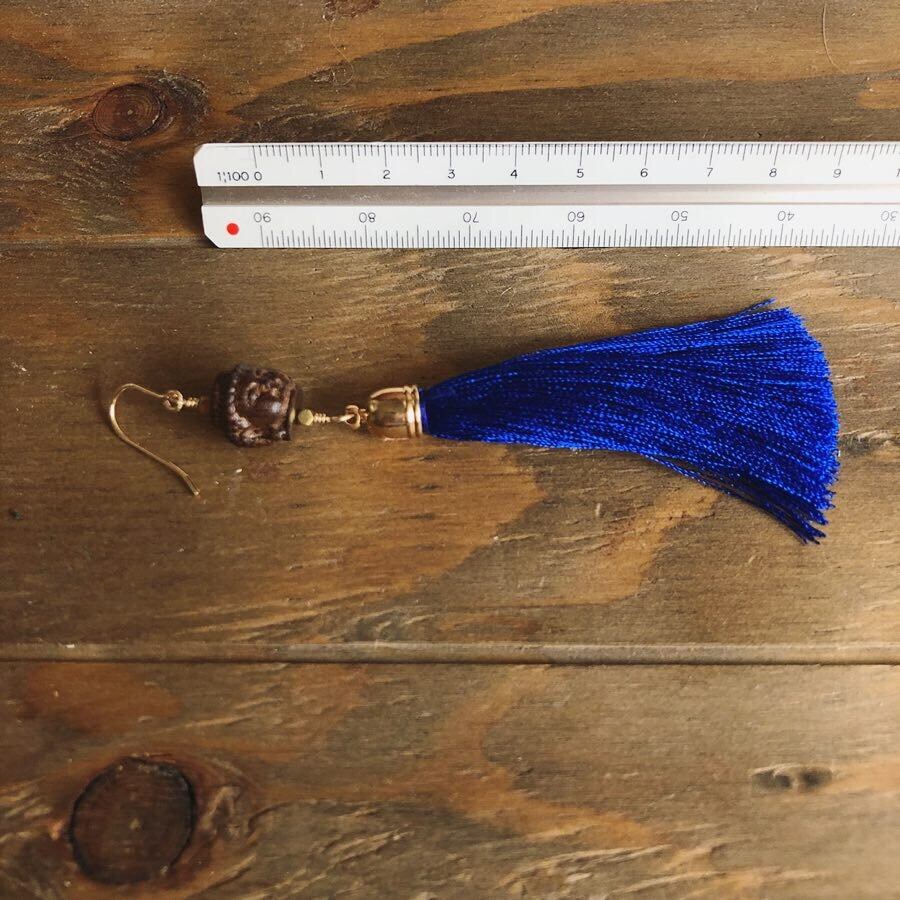 青いタッセルとゴールドコーティングの小粒のヘマタイトを合わせ、ウッドビーズを際立たせています。
