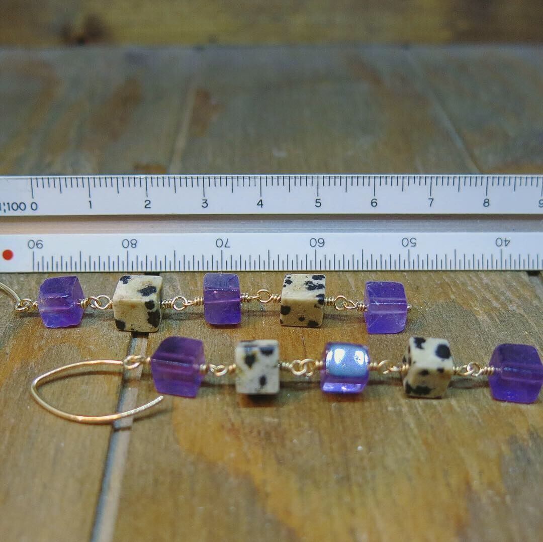 どちらもキューブカットのアメジストとダルメシアンジャスパーを長く連らせました。