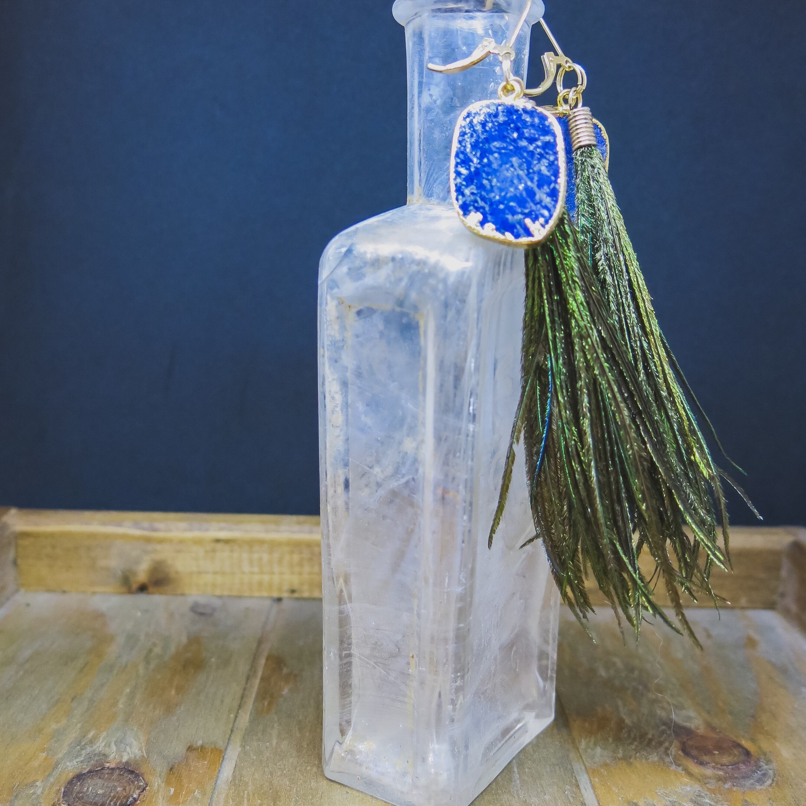 スライスされたラピスラズリに長めのピーコックフェザーを合わせて。