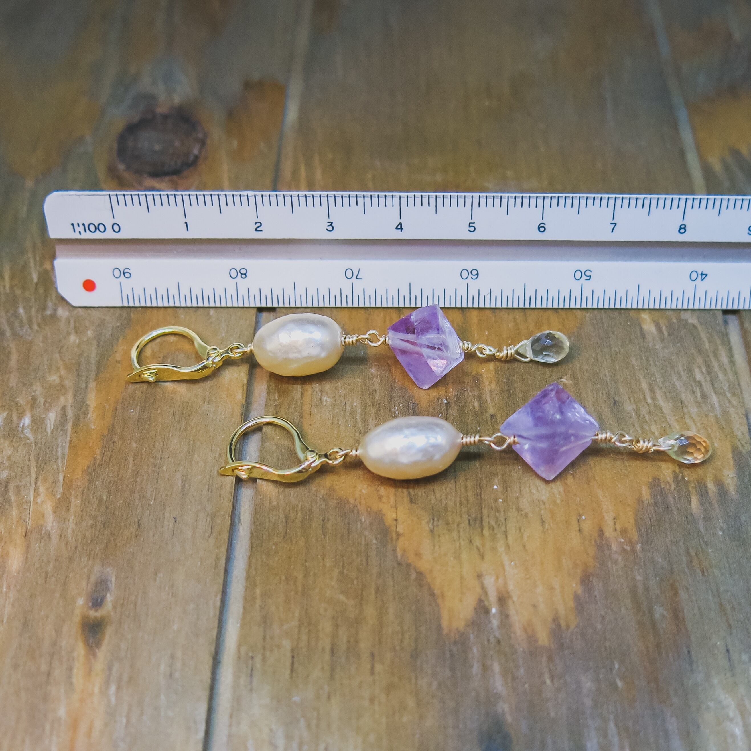 パープルカラーの8面体フローライトに、50年代フランスのガラスパールのパーツとレモンクォーツを合わせました。