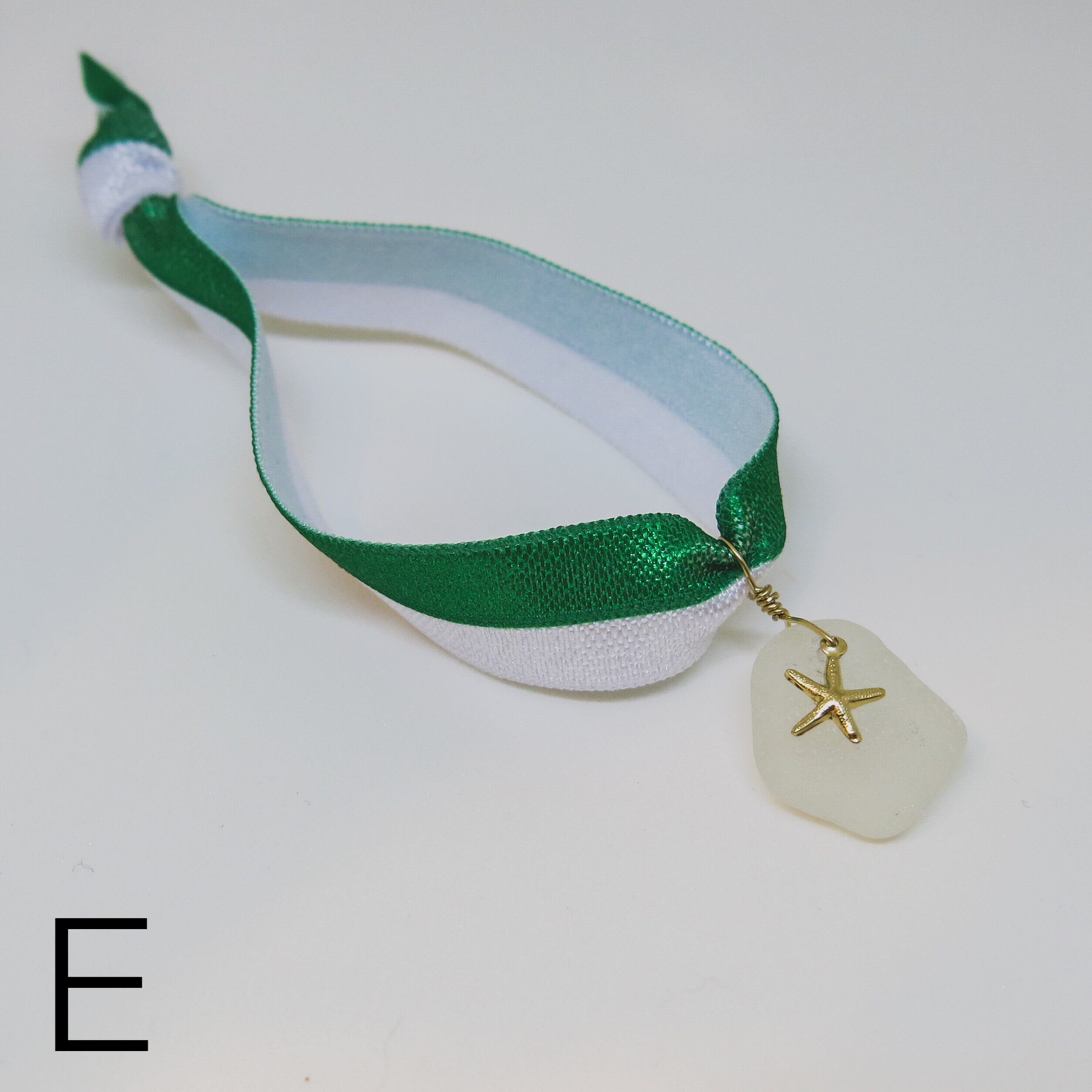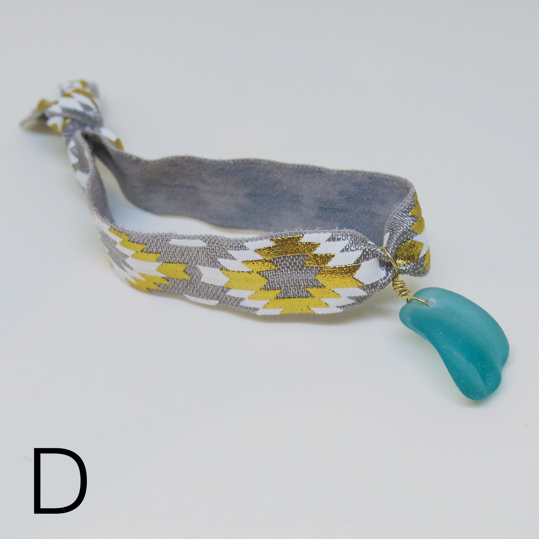 鎌倉や小田原、千葉の海で拾ったシーグラスを、アメリカから厳選して仕入れたヘアタイと合わせてブレスレットにしています。