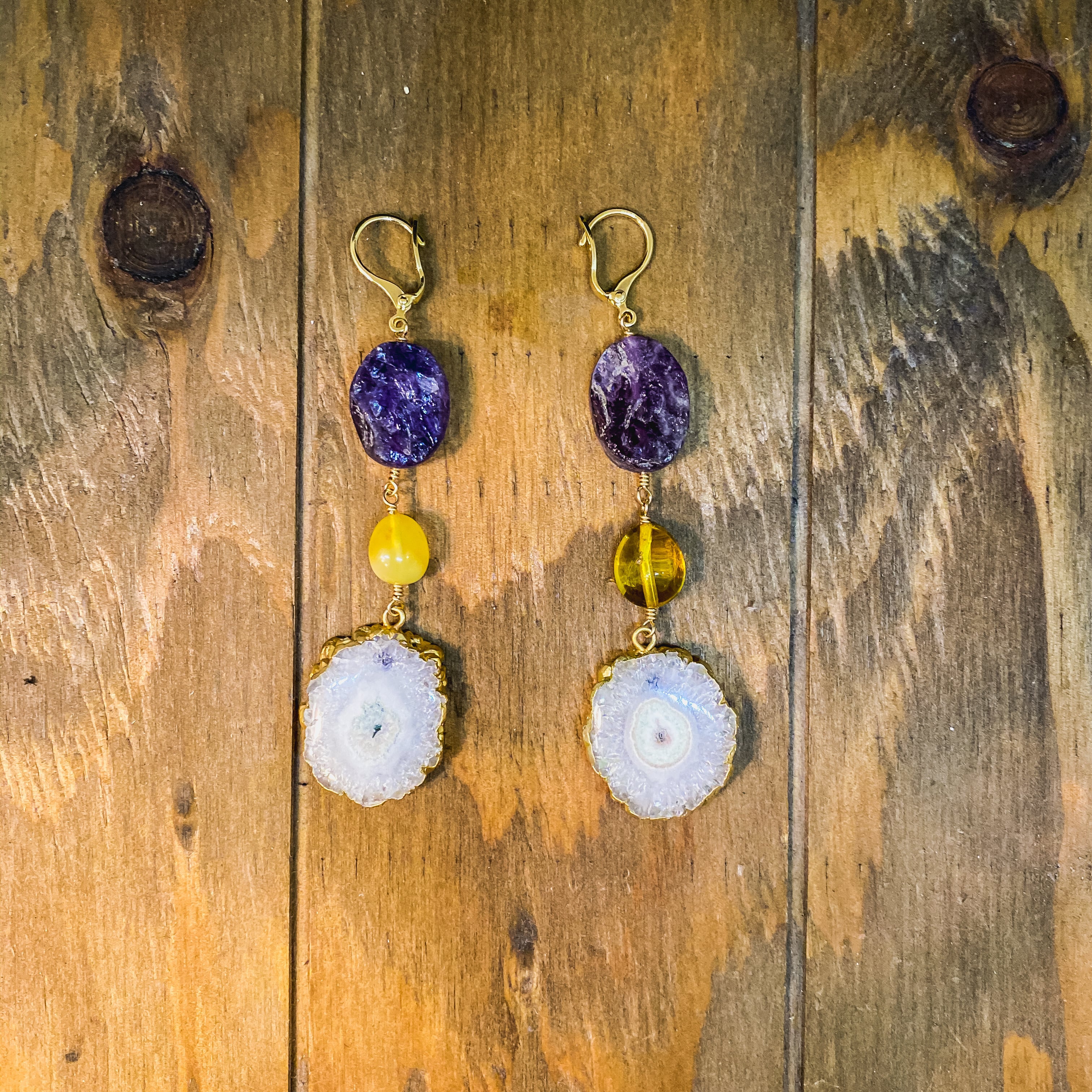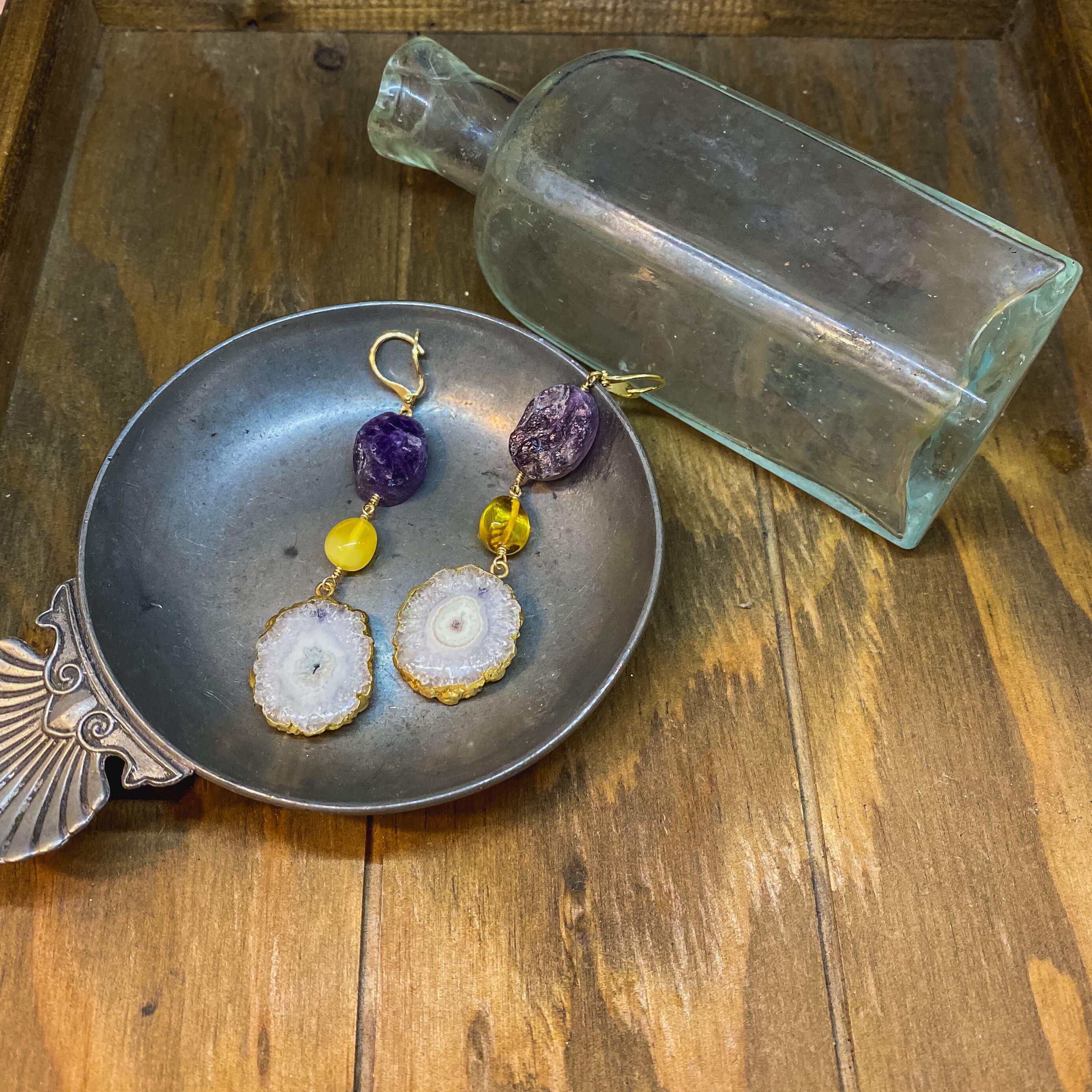 ラフアメジスト×バルティックアンバー×ソーラークォーツのピアス