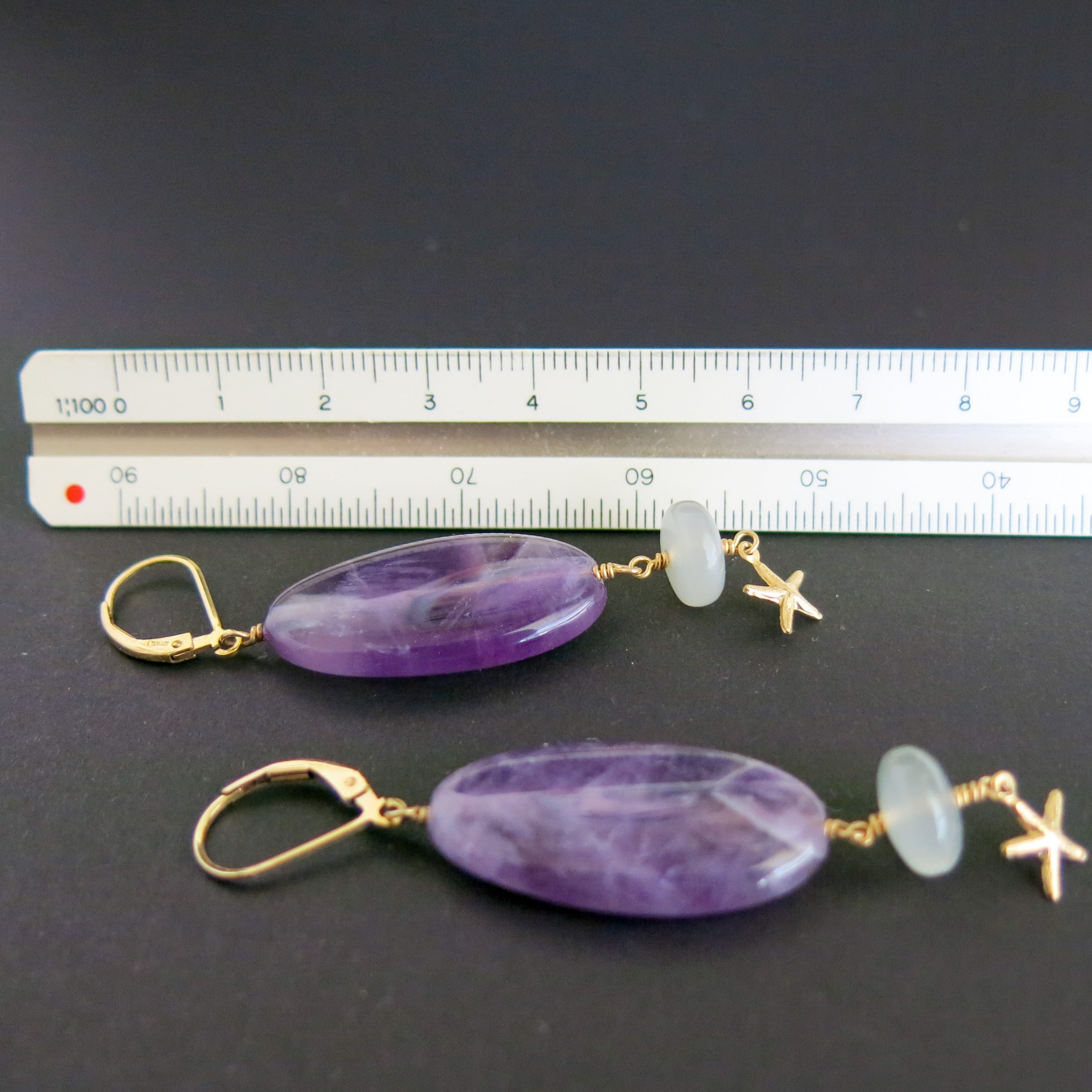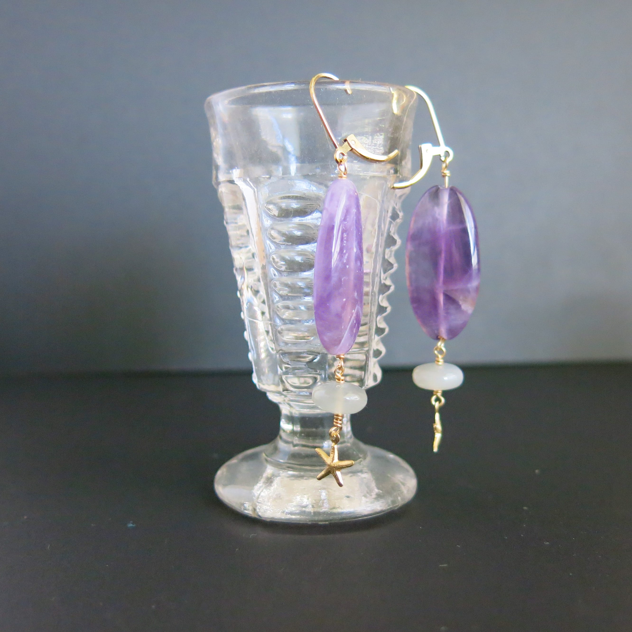 美しい断層がみえるシェブロンアメジストにムーンストーンとヒトデチャームを合わせました。