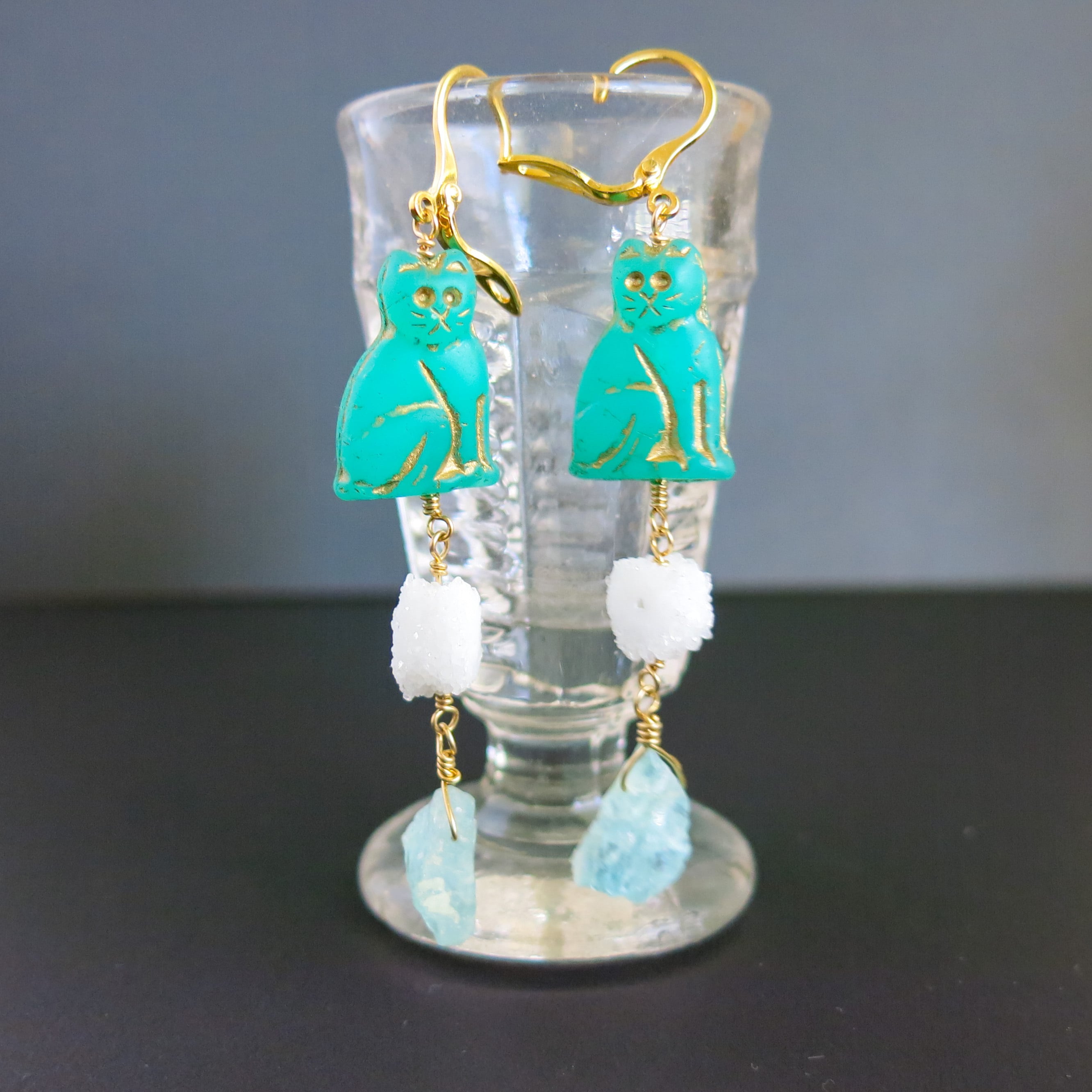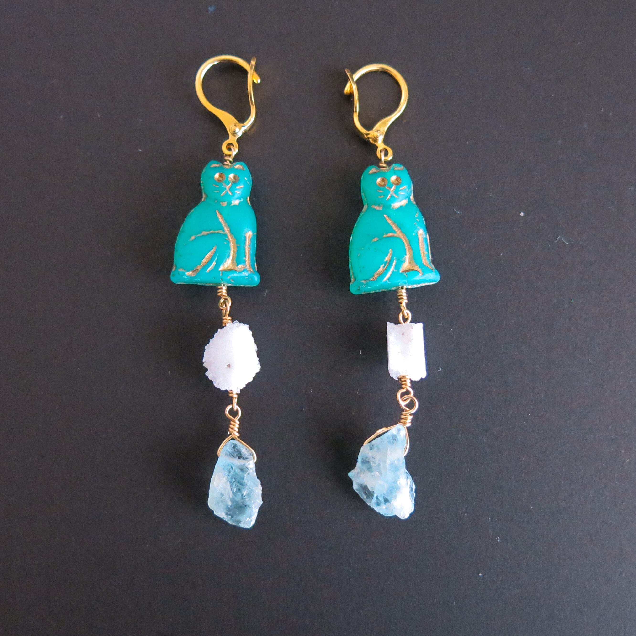 今回は、ターコイズカラーのねこビーズに、砂糖菓子をおもわせるようなかわいいドゥルージーと、原石感あるアクアマリンを合わせ、涼やかな色合いに。
