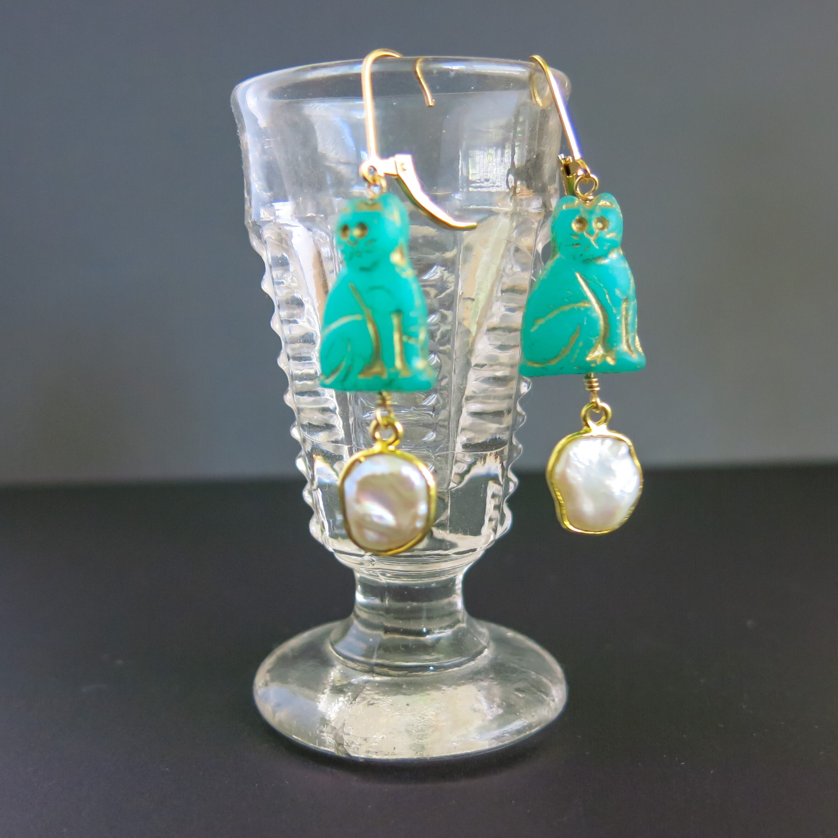 今回は、ターコイズカラーのねこビーズに、24kゴールドメッキの枠付き淡水パールを合わせました。
