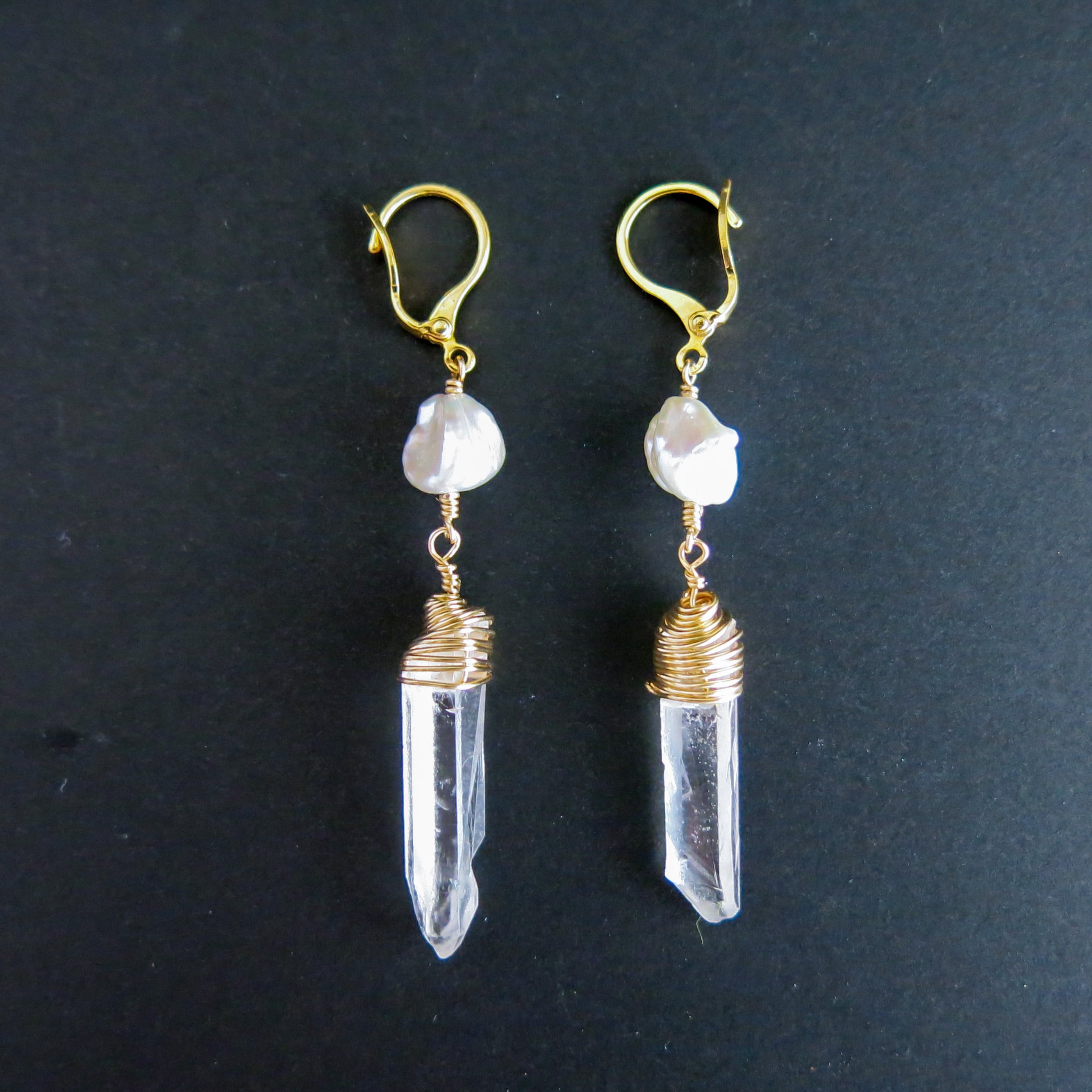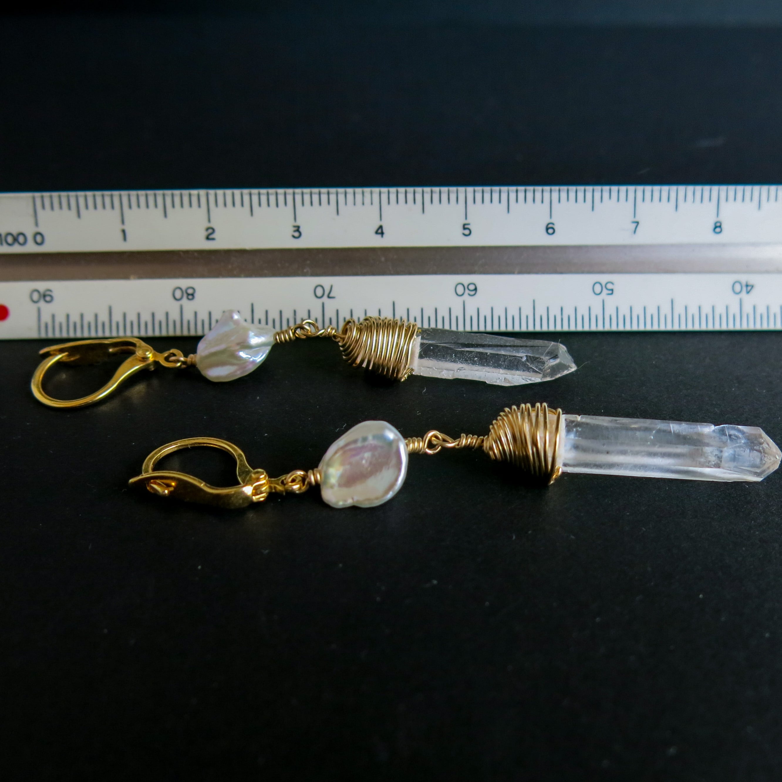輝きの美しいバロック状のケシパールに、ゴールドフィルドのワイヤーを巻いた氷柱クォーツを合わせてカラーレスでシンプルに仕上げました。