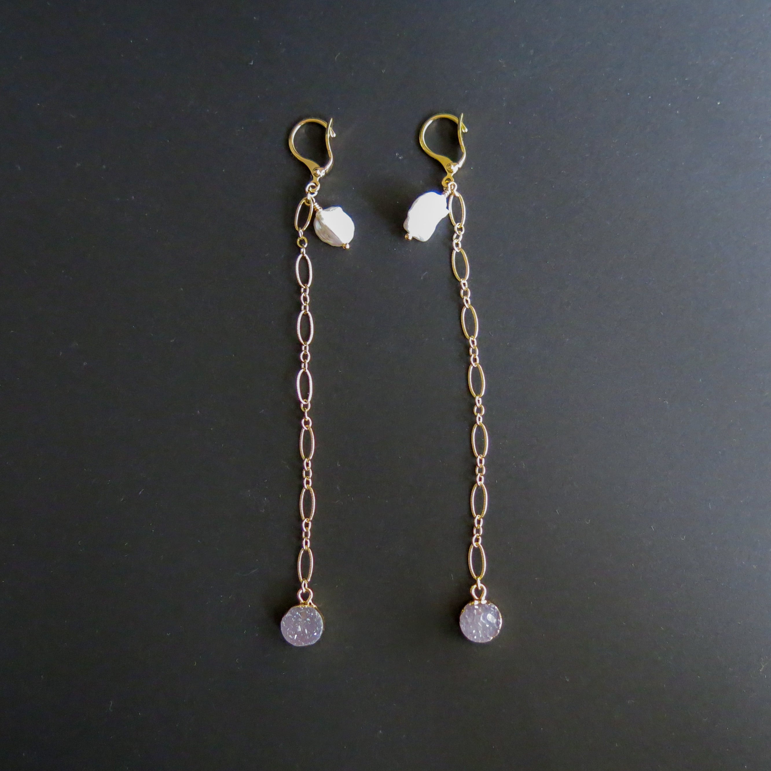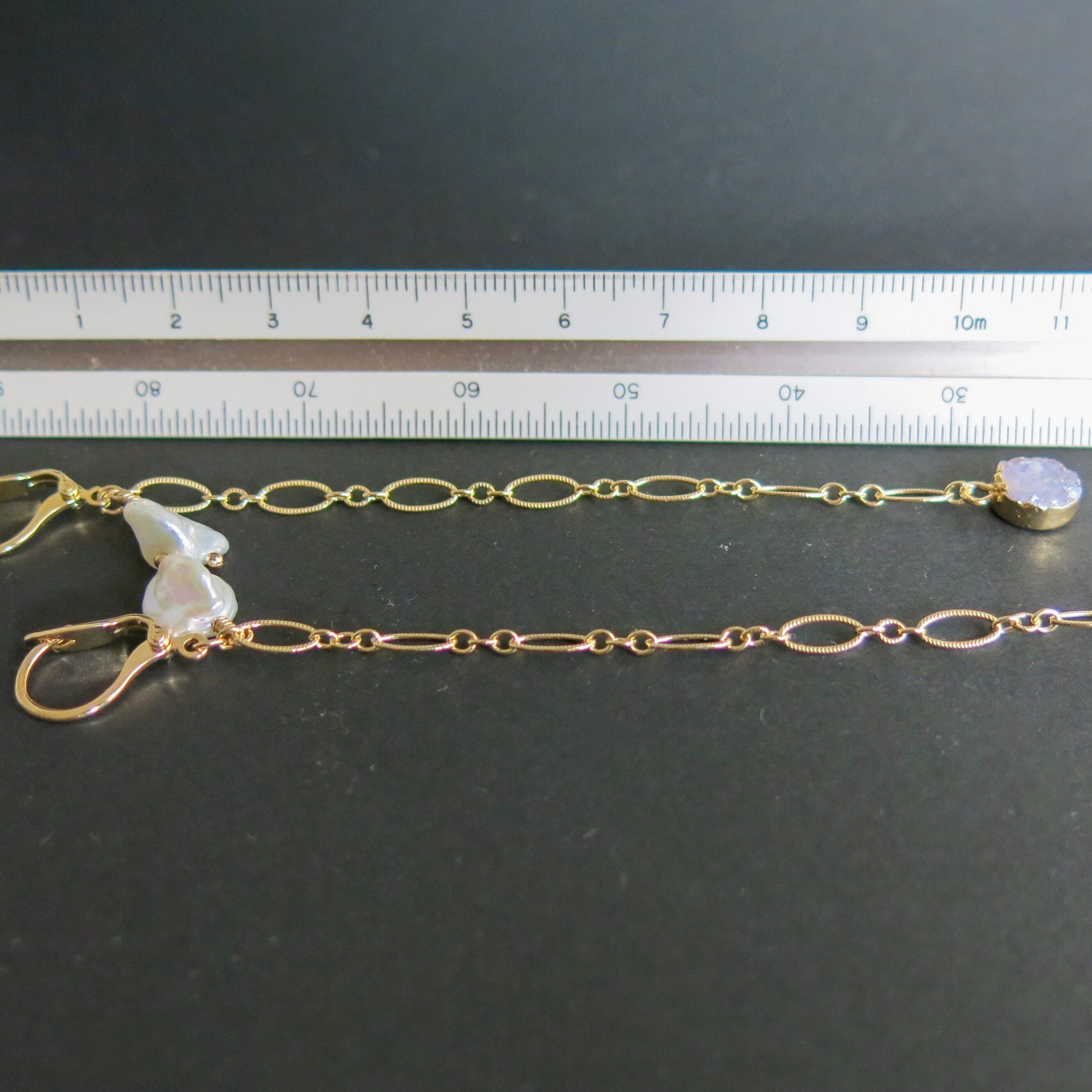 輝きの美しいケシパールに、変わった形のフィガロチェーンを合わせ、ドゥルージーパーツをつけました。