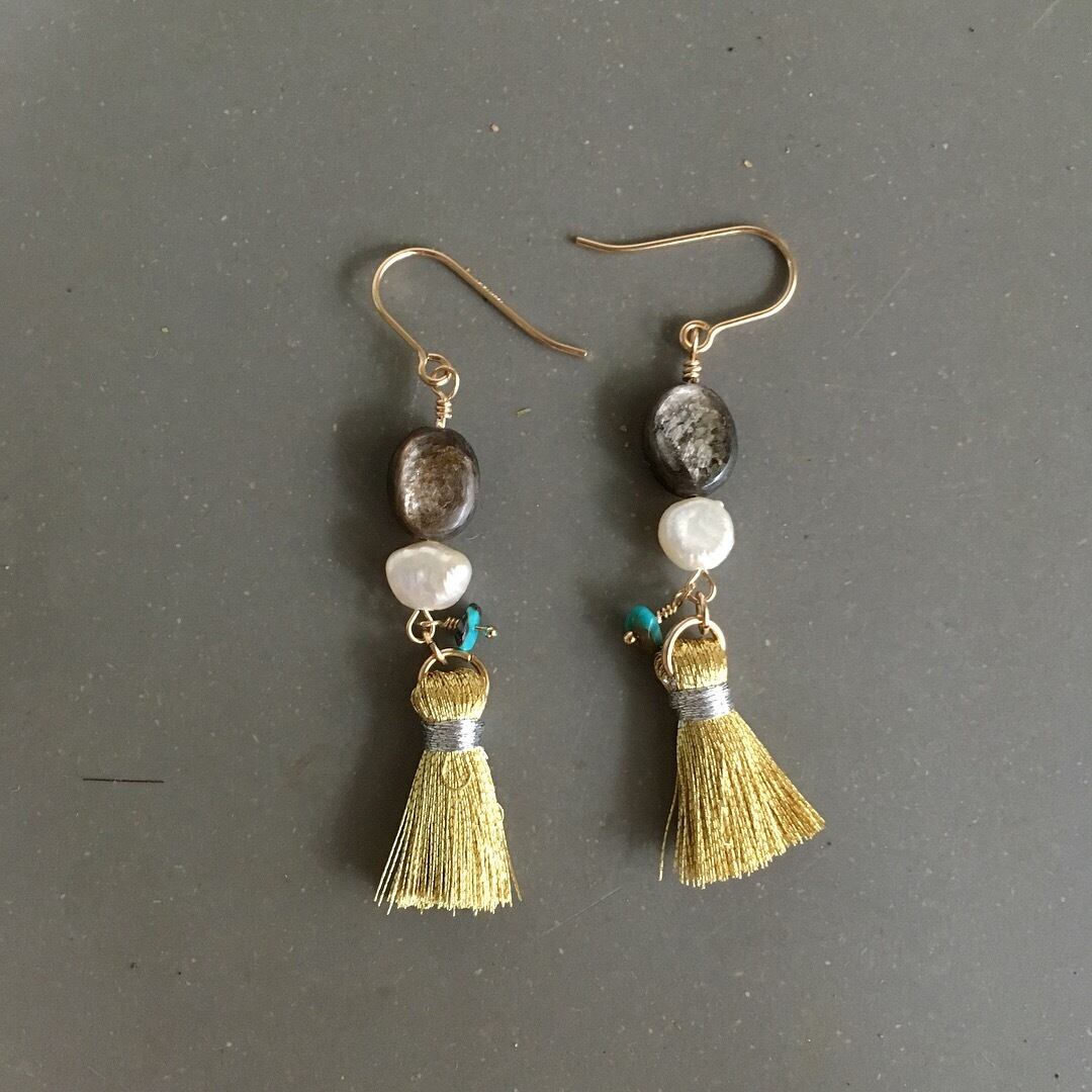 モスコバイトと淡水パールを連らせ、ゴールドタッセルでゴージャスにまとめました。