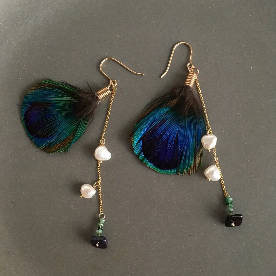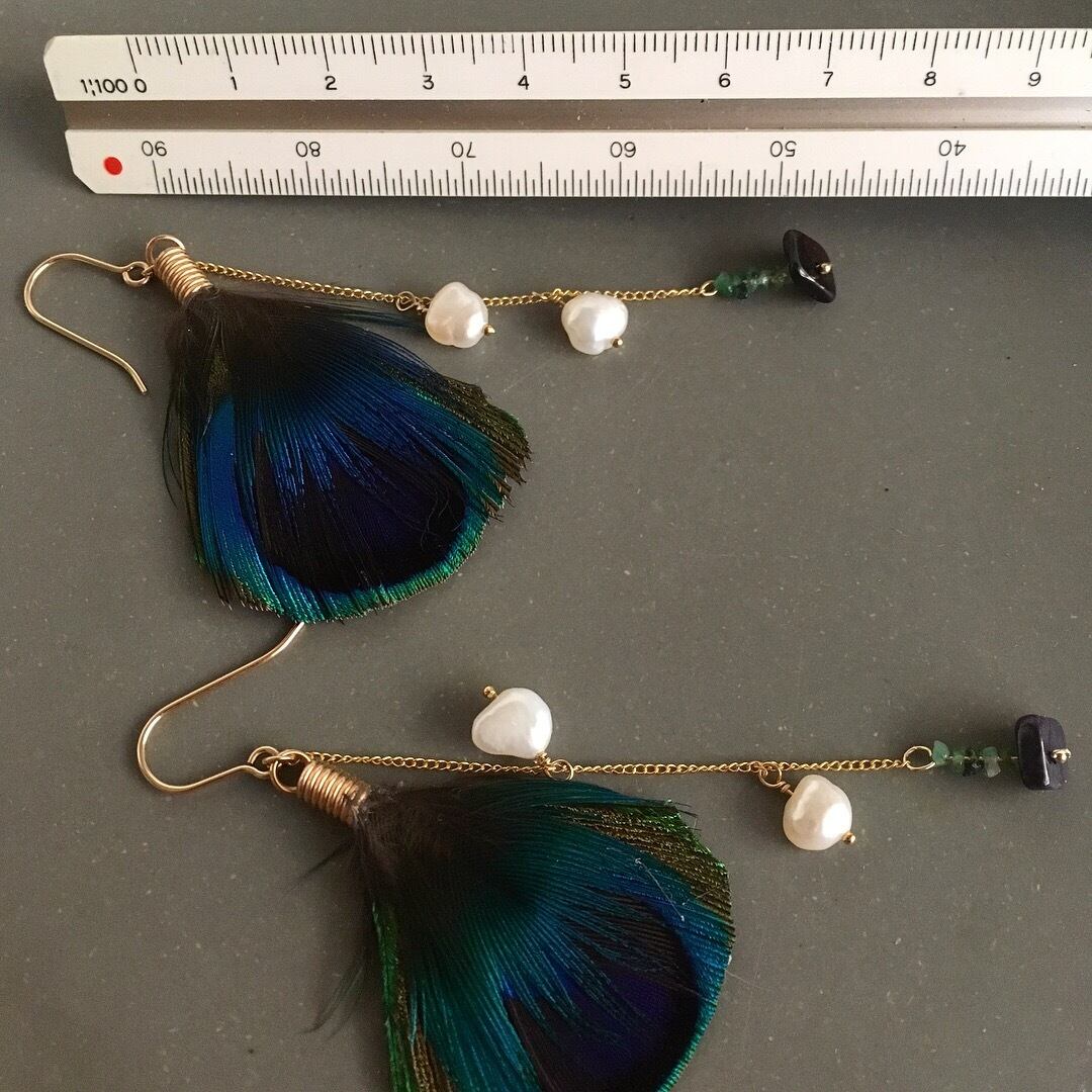 ピーコックフェザーにゴールドフィルドのチェーンを合わせ、スギライトと小さな粒のエメラルドでピーコックのカラーとリンクさせました。