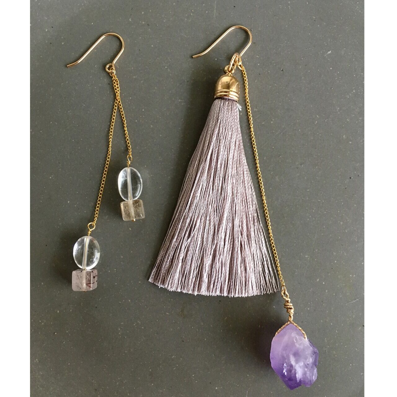 ゴツゴツとしたラフロックのアメジストとグレージュカラーのタッセルを組み合わせました。