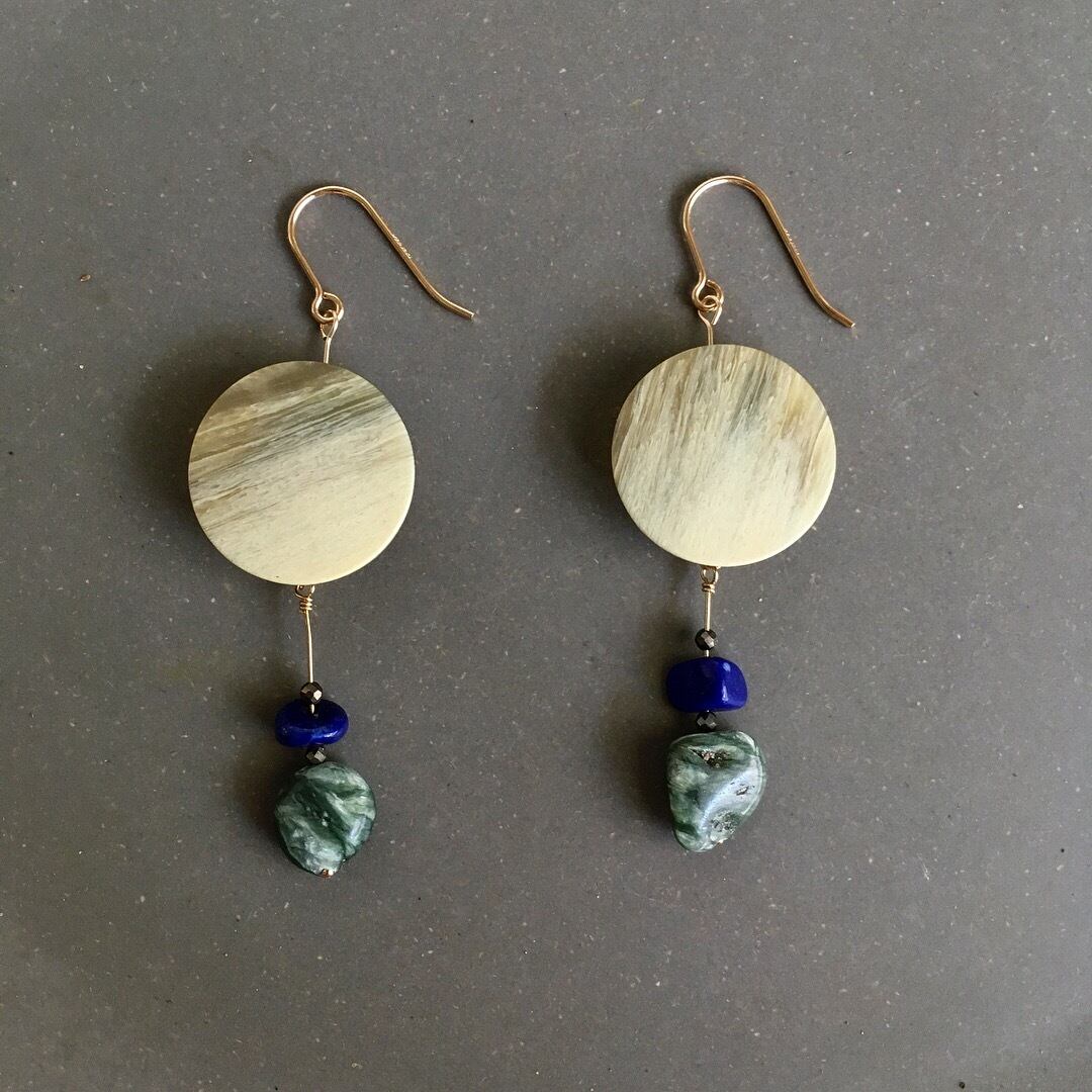 蚤の市で仕入れたアンティークのボタンに、ラピスラズリとセラフィナイトで落ち着いた色合いにまとめました。