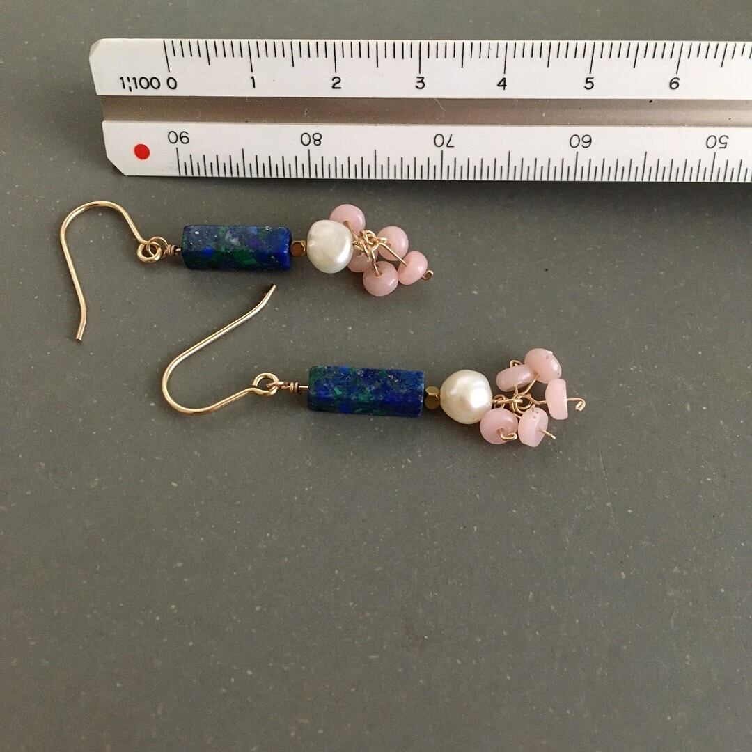 レクタングル(長方形)のアズライトに、淡水パールとソープストーンを合わせ、優しい印象に仕上げました。