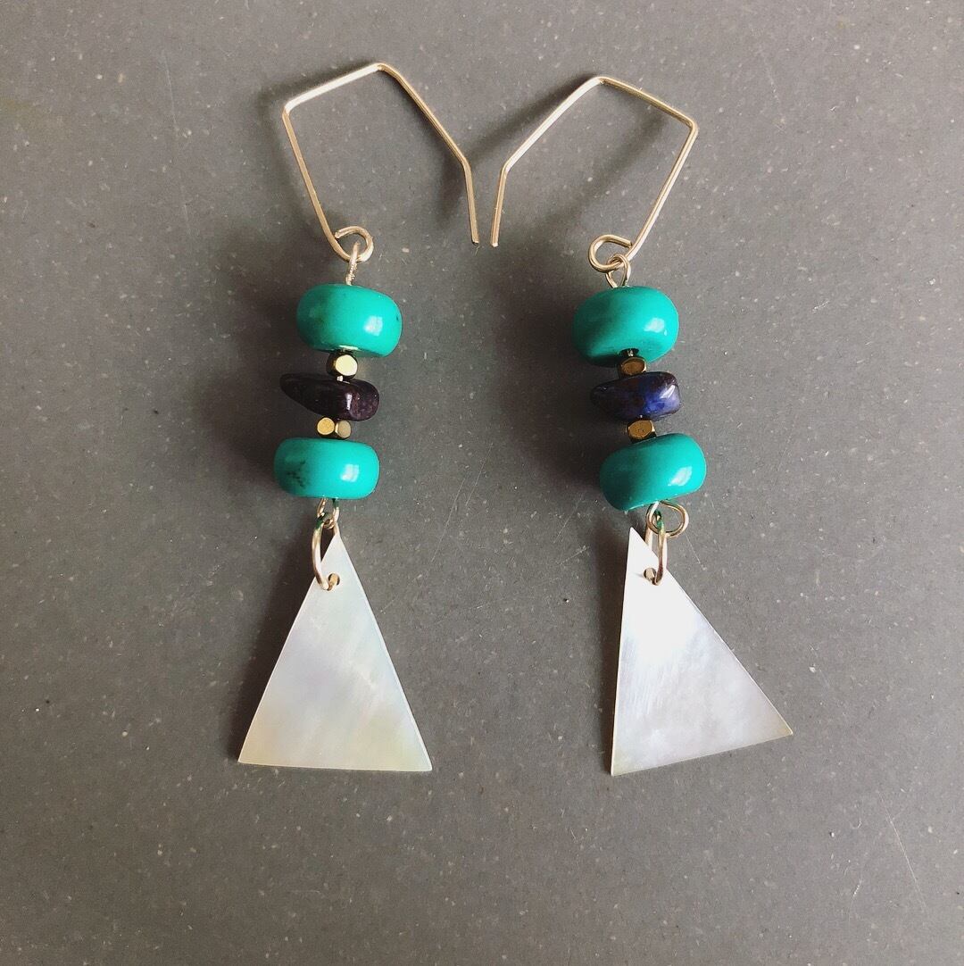 蚤の市で仕入れたアンティークのグリーンターコイズとスギライトを合わせ、トライアングル型のマザーオブパールを付けました。