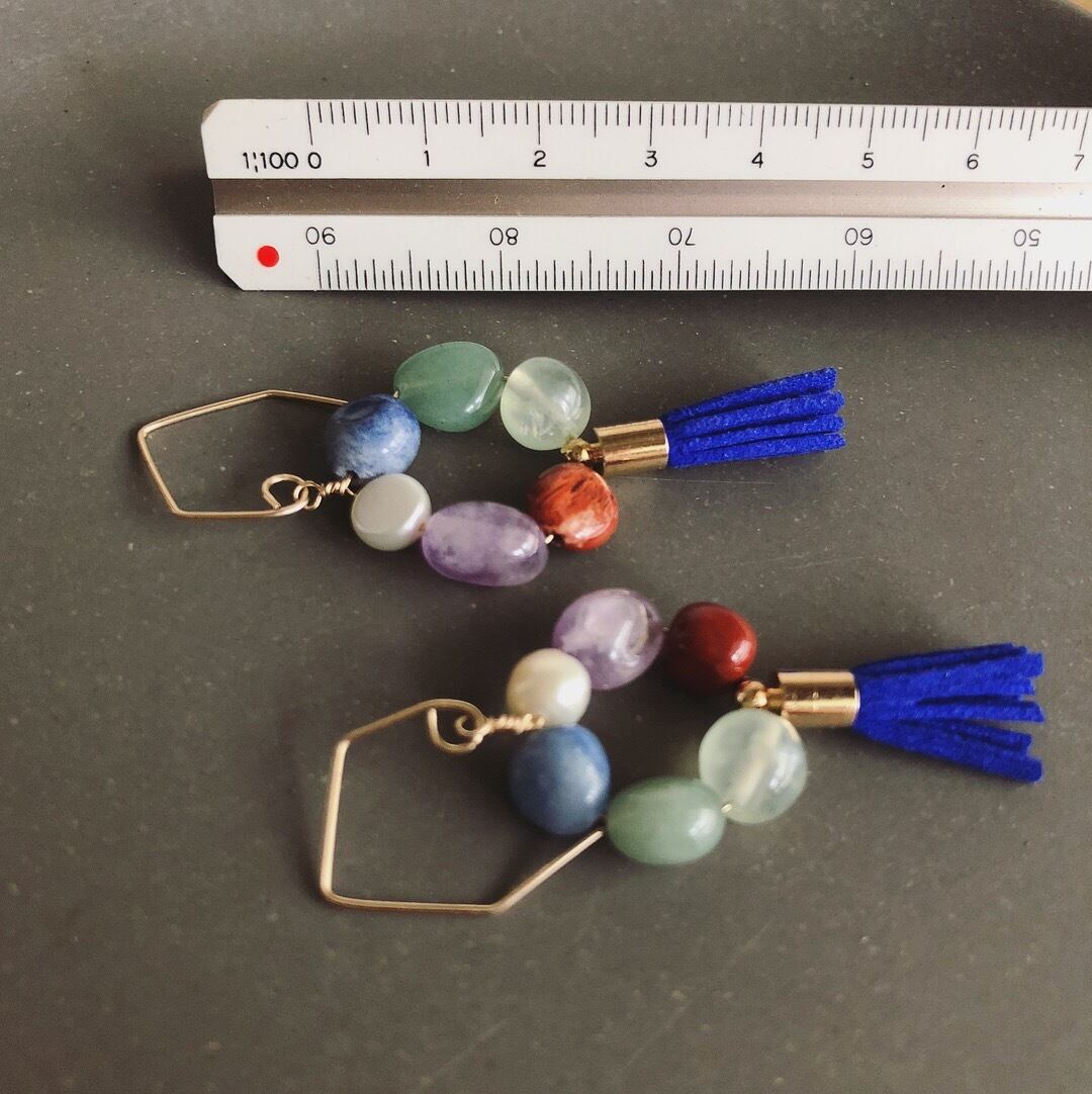 ライトカラーアメジスト、レッドジャスパー、デュモルチェライト、アマゾナイトなどのカラーストーンと淡水パールをサークル状にし、スエード調の鮮やかなブルーのタッセルと合わせました。