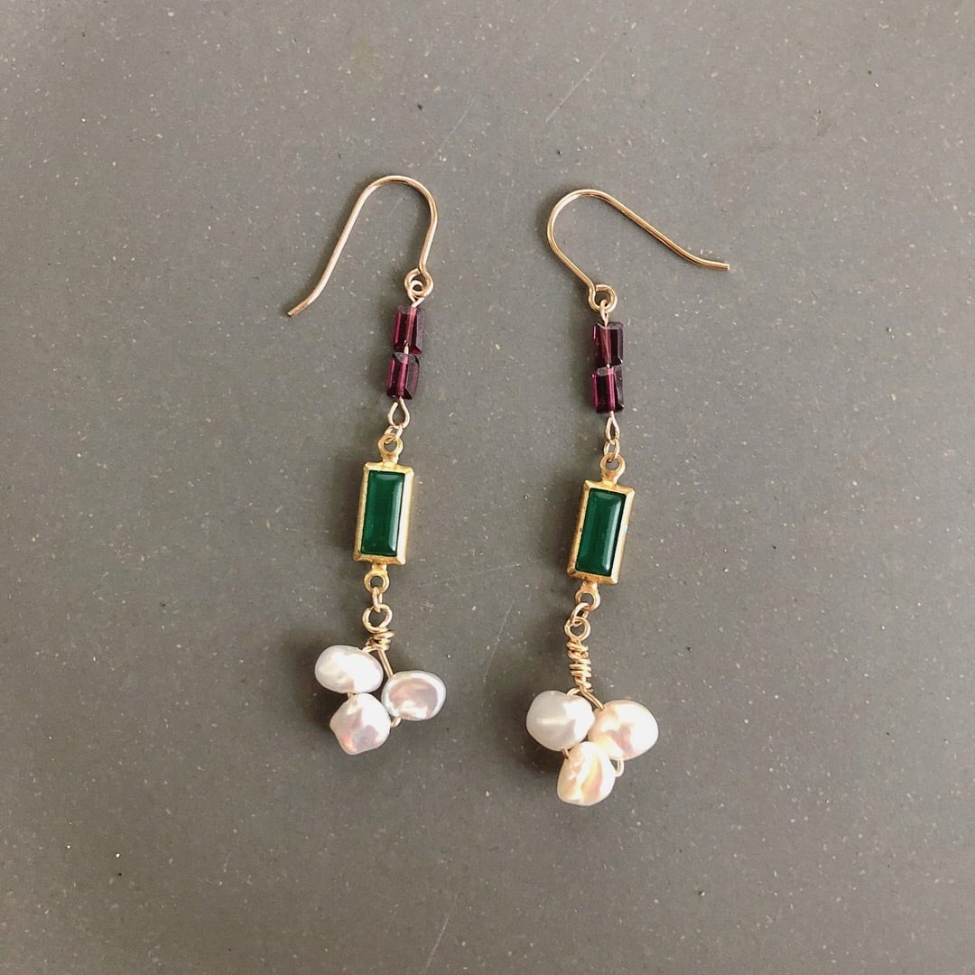 蚤の市で仕入れたアンティークパーツとレクタングル(長方形)カットのガーネットを合わせ、ケシパールを付け、贅沢に仕上げました。