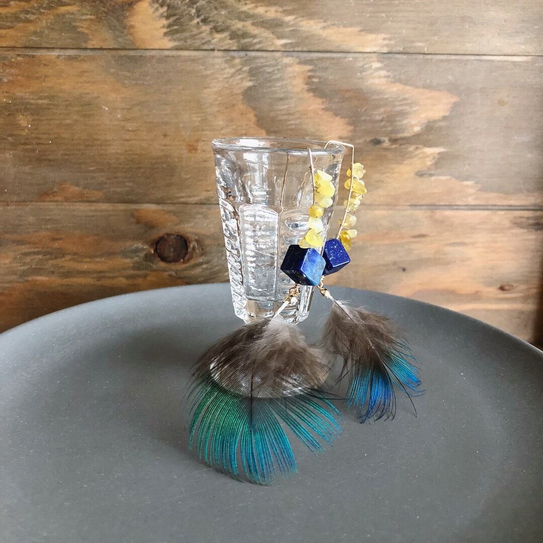 オリジナルフックにはイエローオパール、ダイス型のラピスラズリにピーコックフェザーを合わせ、華やかに仕上げました。