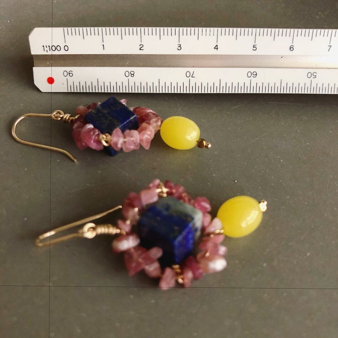 珍しいダイス型カットのラピスラズリを、ピンクトルマリンで囲み、きれいな黄色のアンティークガラスパーツを組み合わせました。