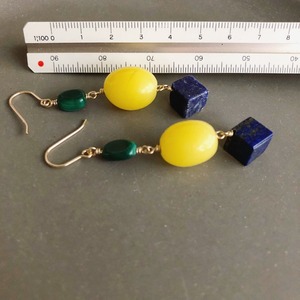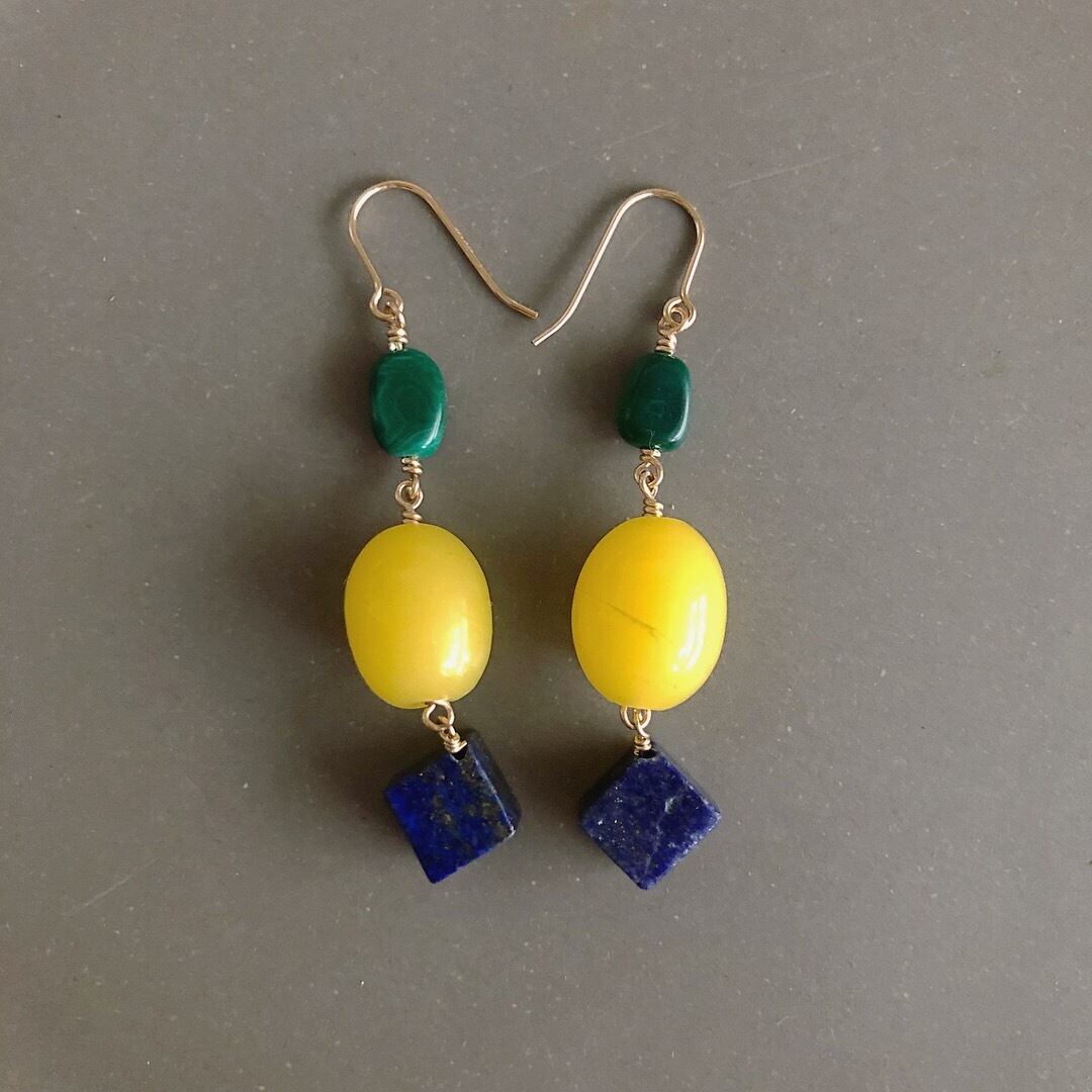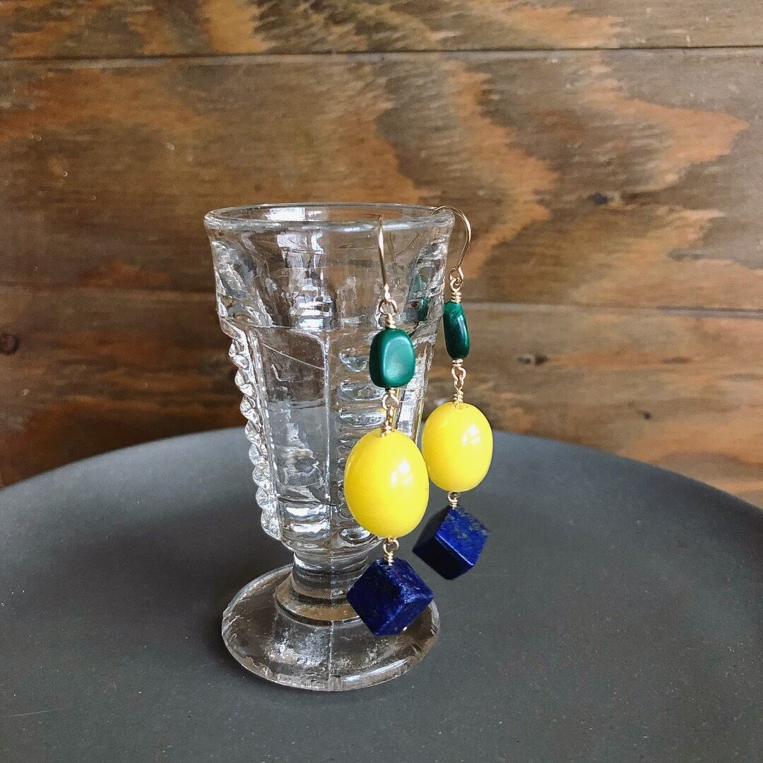 少し大きめの黄色がきれいなアンティークガラスパーツと藍色のラピスラズリ、深い緑のマラカイトを合わせ、大人っぽく仕上げました。