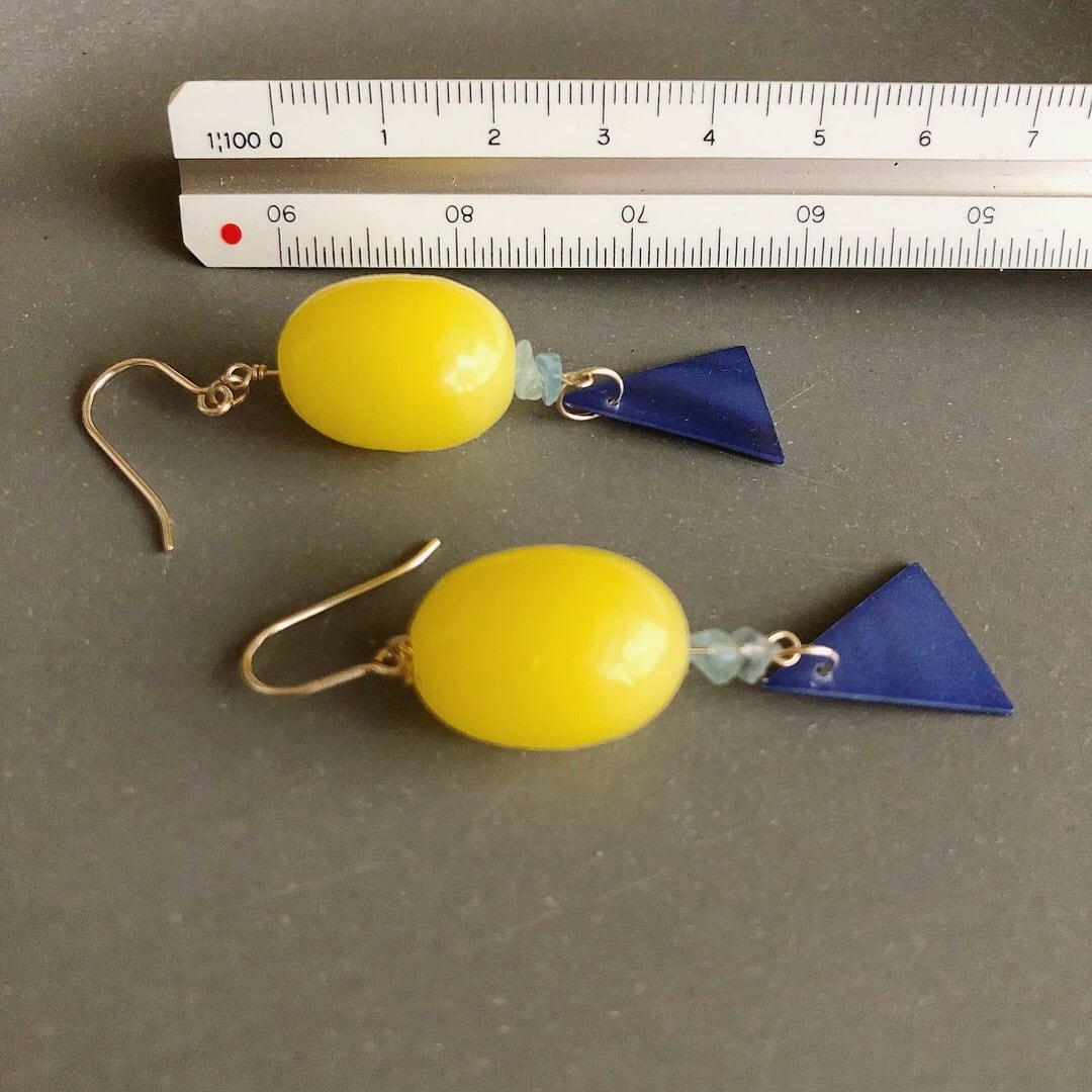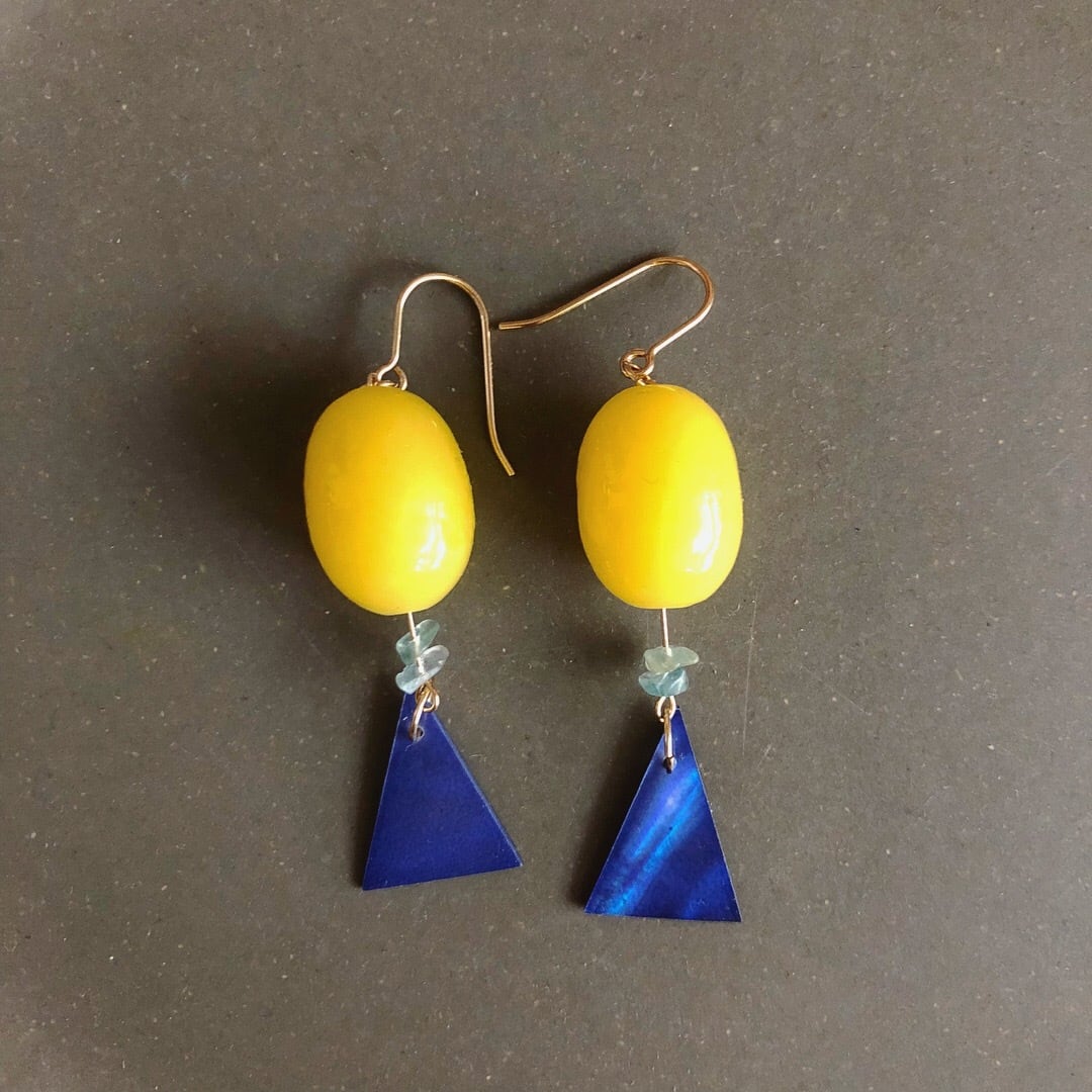 蚤の市で仕入れたとても大きく黄色がきれいなアンティークガラスパーツ、そして同じく蚤の市で手に入れたアンティークのフローライトと青色に染められたトライアングル型のシェルを合わせ、爽やかに仕上げました。