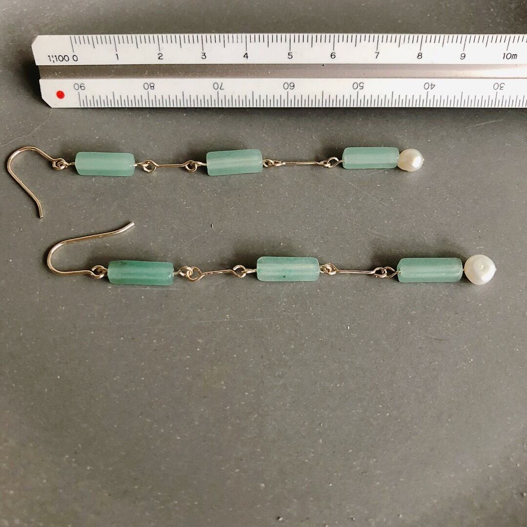 レクタングル(長方形)のグリーンアベンチュリンを連らせ、淡水パールを付けました。