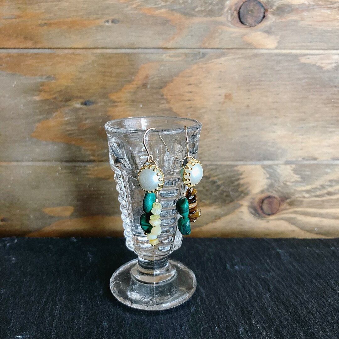 蚤の市で仕入れたパール調のアンティークパーツに、11月の誕生石のマラカイトを合わせ、タイガーアイとイエローオパールをアシンメトリーに付けました。