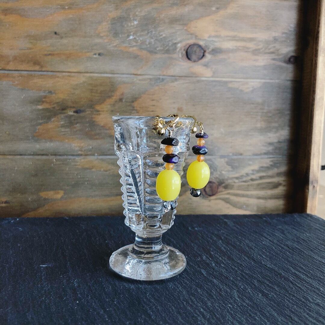 少し大きめの黄色がきれいなアンティークガラスパーツと深い紫色のスギライト、オレンジ色のカーネリアン、落ち着いた色のクォーツを使い、ポップな色合いながらも落ち着いた雰囲気に仕上げました。