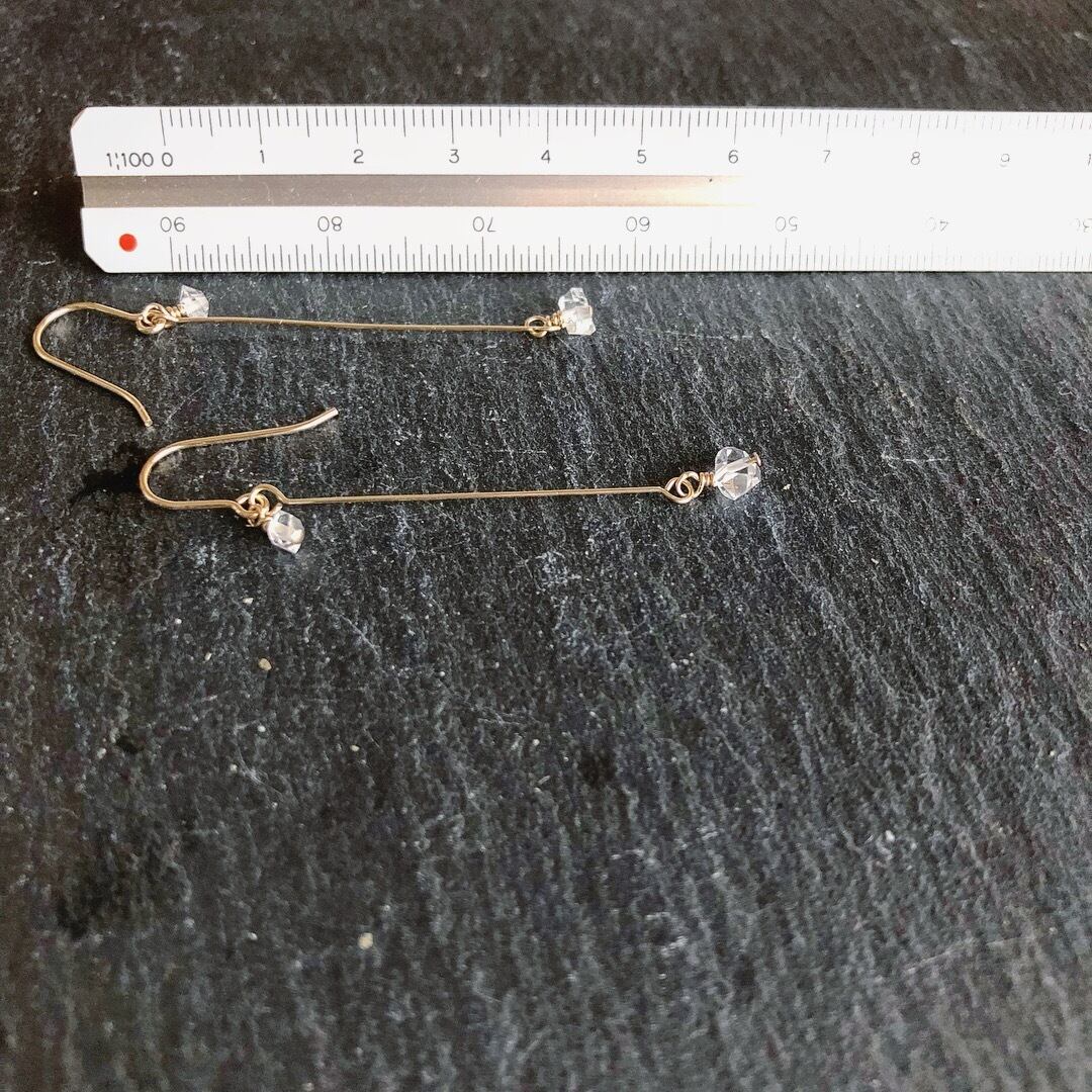 フックの下に小粒のハーキマーダイヤモンド、その下にぶら下がるワイヤーにも小粒のハーキマーダイヤモンドをあしらい、シンプルで華奢ながらも存在感ある仕上がりにしました。