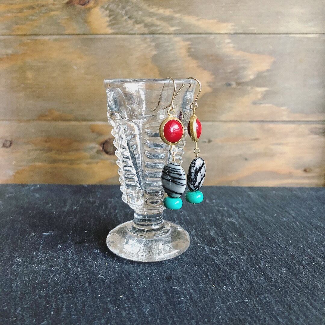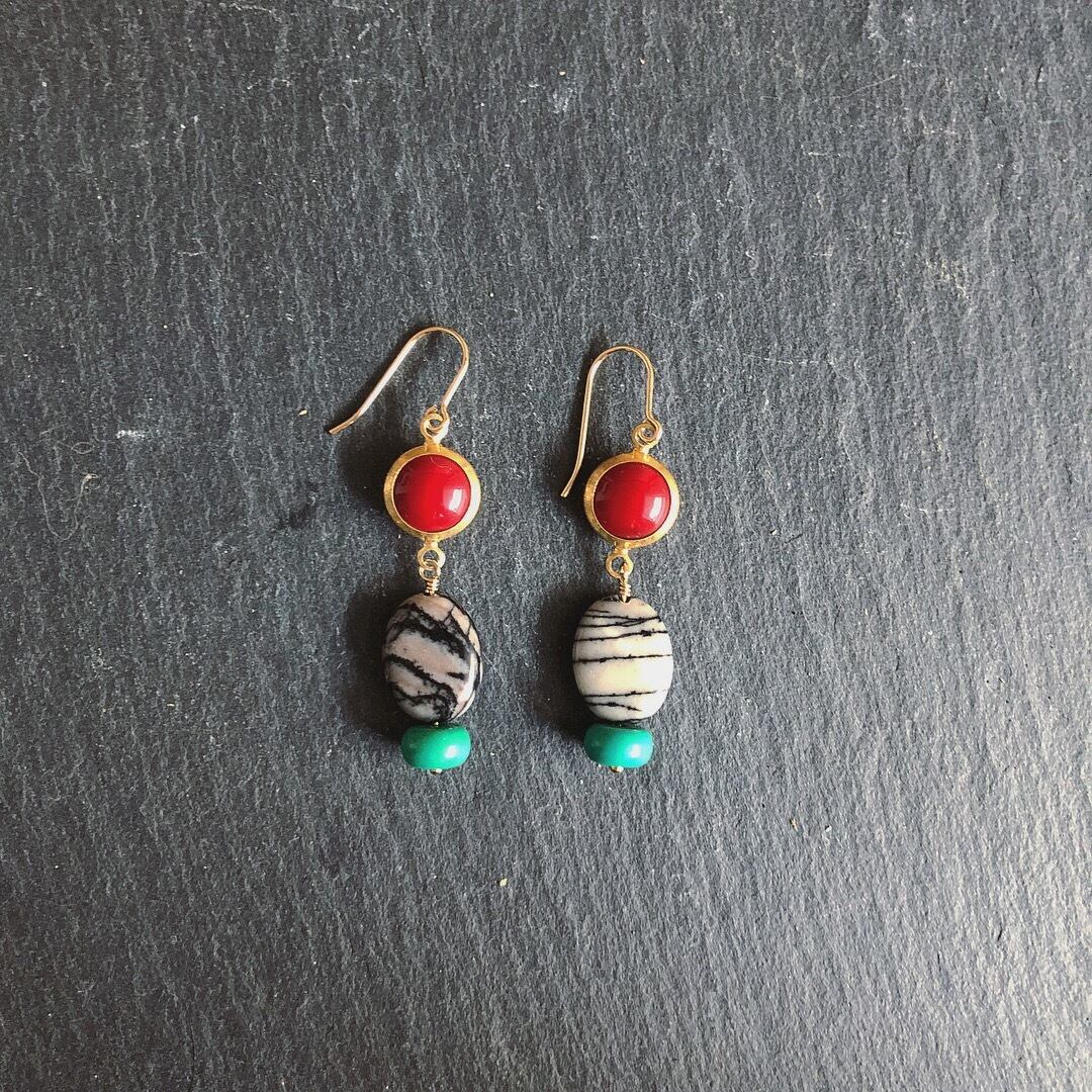 縞模様が特徴的なゼブラジャスパーに、レッドカラーのアンティークガラスパーツとアンティークターコイズでレトロ感あるカラーリングにしました。
