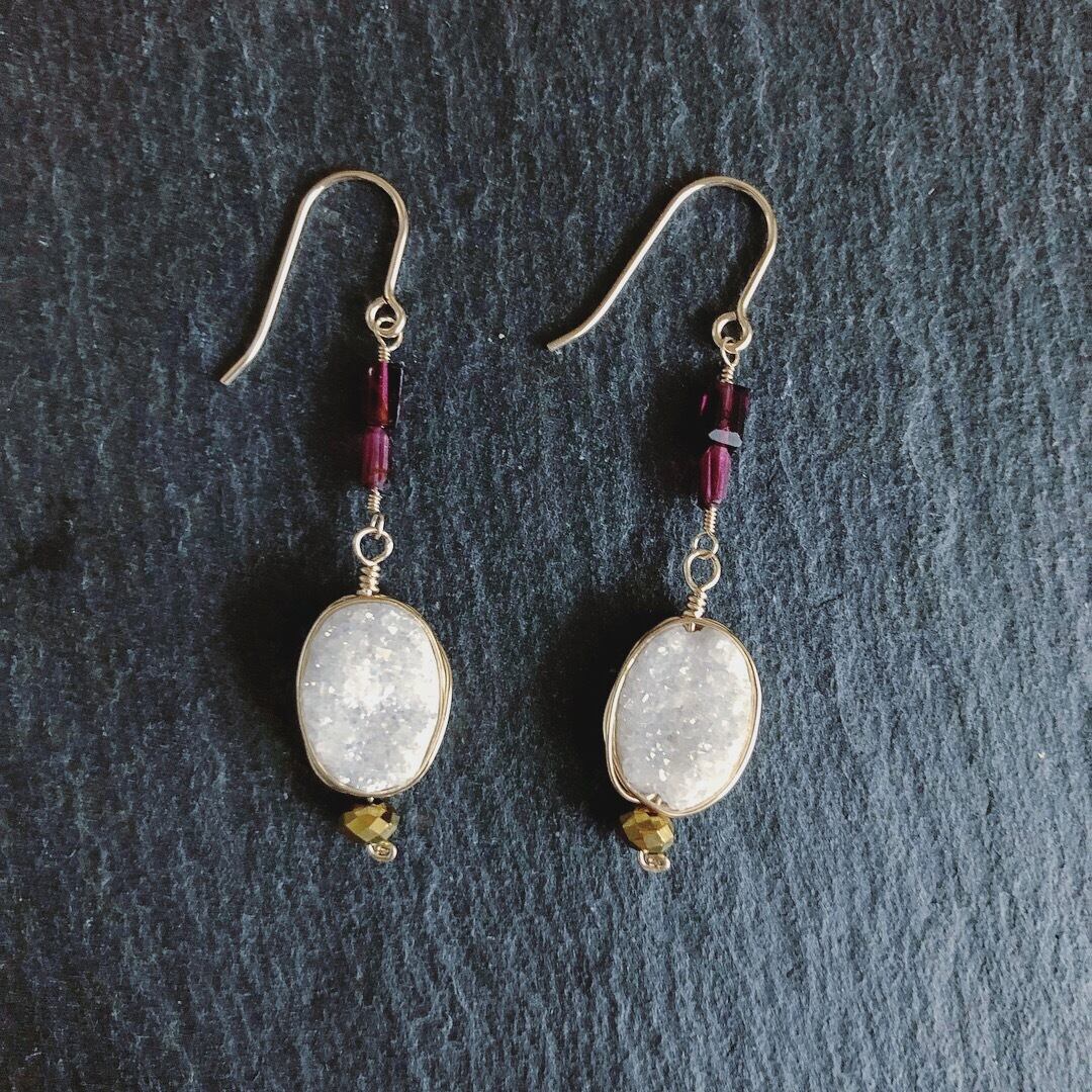 レクタングル(長方形)カットのガーネットとキラキラした輝きの美しいドゥルージーを合わせ、華奢ながらも華やかに仕上げました。