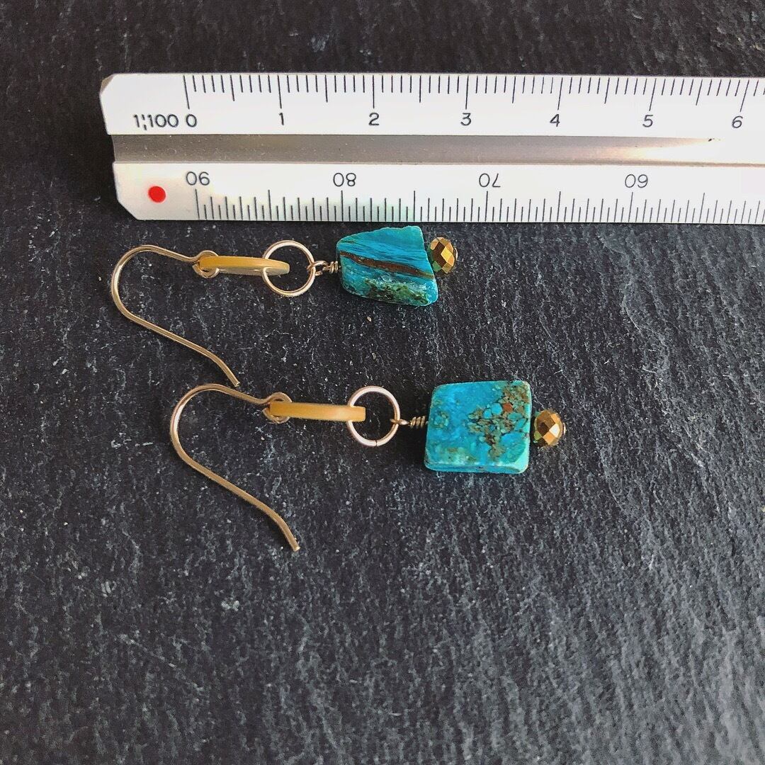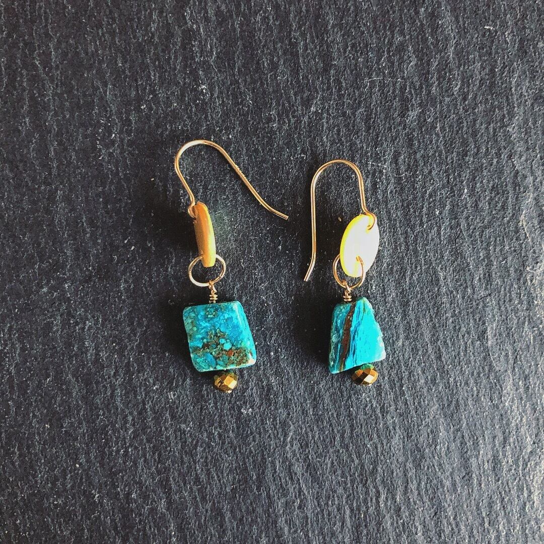 2つ穴のマザーオブパールに、スライスカットのブルーオパールを合わせ、ポイントカラーにゴールドコーティングのガラスビーズを合わせ、甘辛な仕上がりにしました。