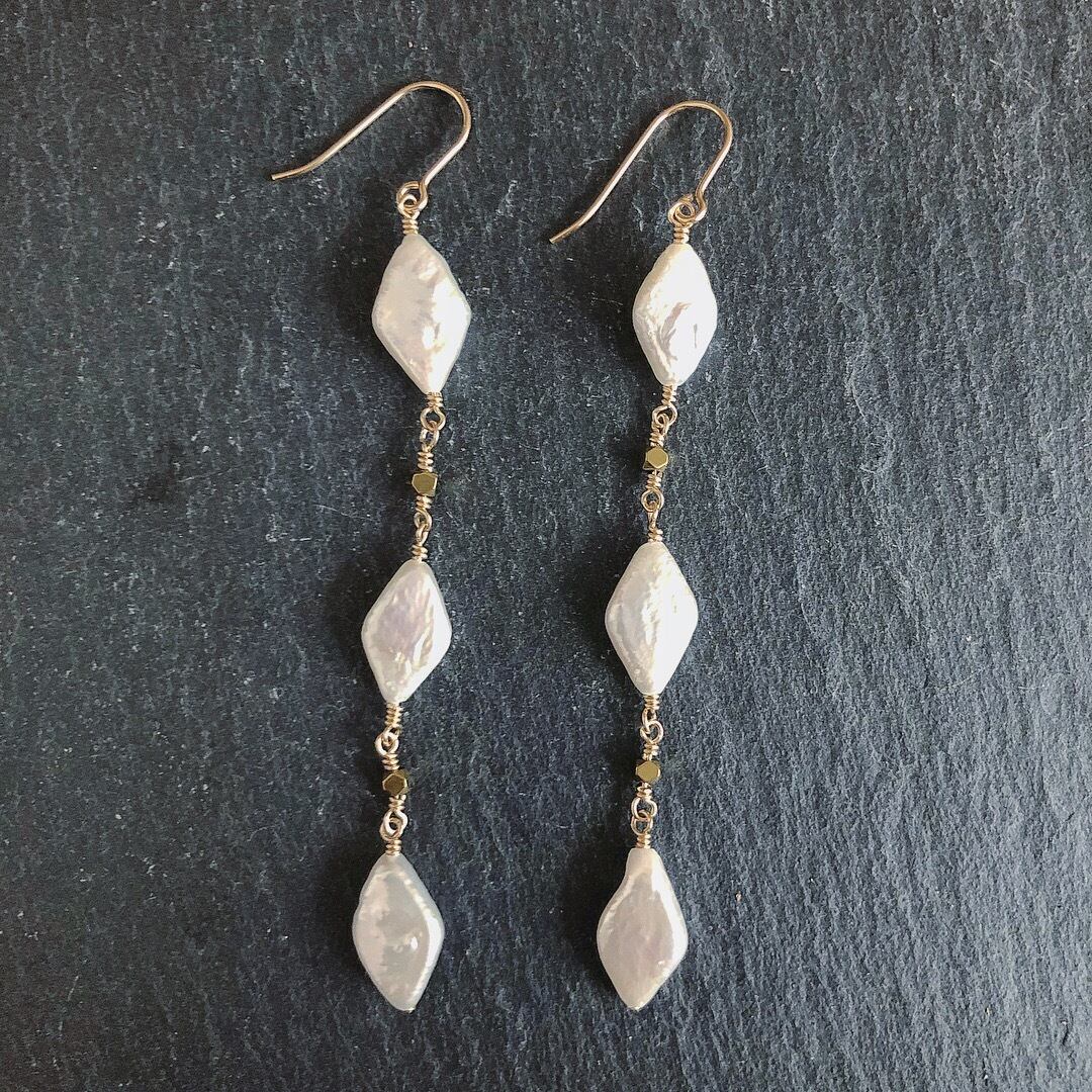 ひし形の淡水パールにゴールドカラーコーティングされたヘマタイトを合わせ、かわいらしくも落ち着いた仕上がりにしました。